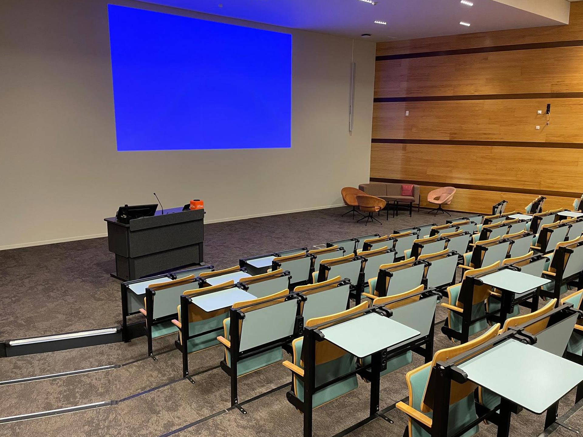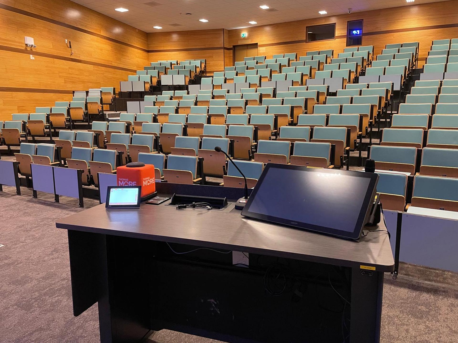 One of the key lecture spaces at Thomas More is a large auditorium designed to accommodate up to 250 students. Historically, this space featured a fixed, custom-built lectern made from MDF wood. While functional for many years, the lectern was tailored to standing presenters and lacked the flexibility needed to support inclusive teaching practices.