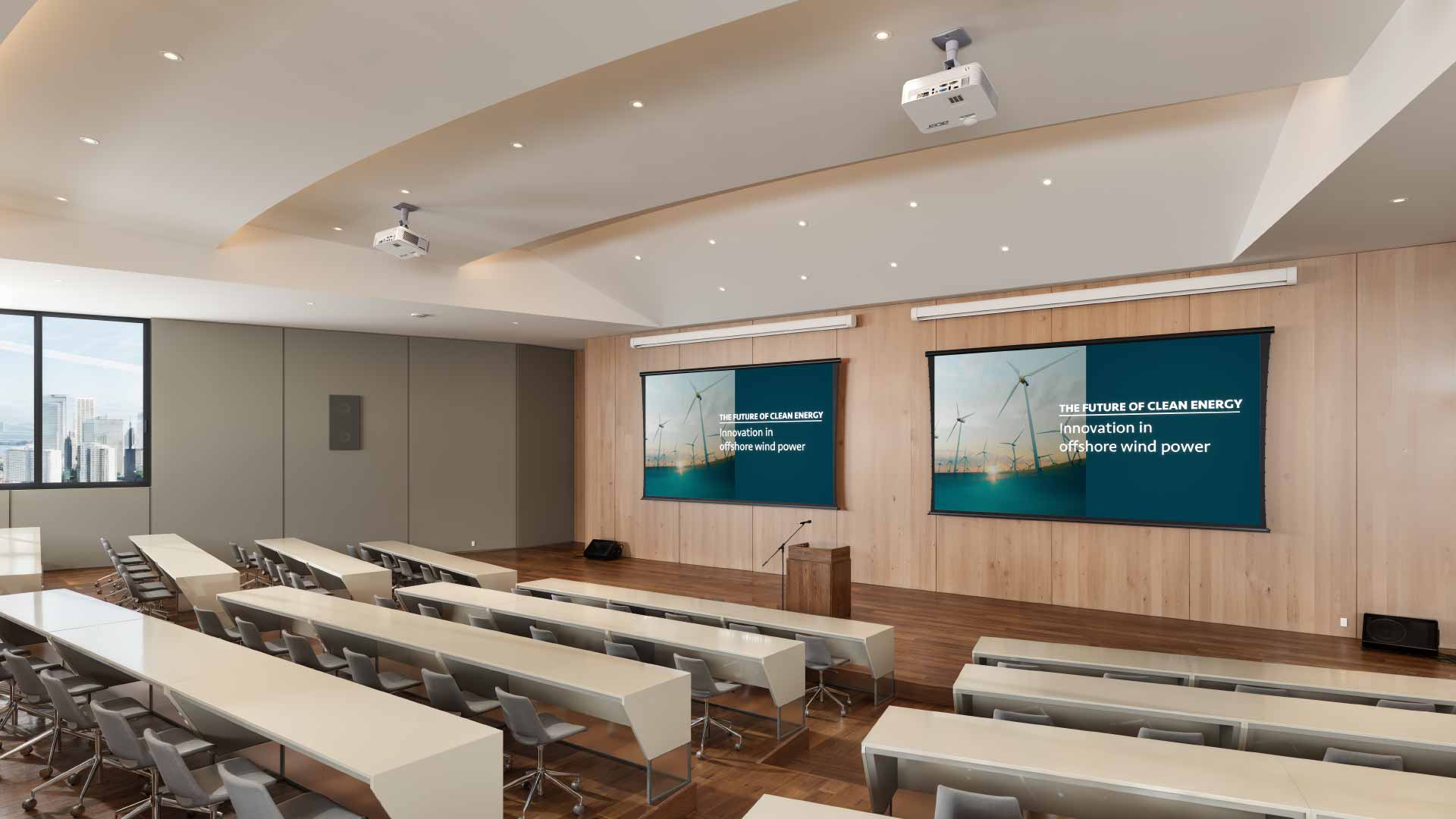 Projection screen innovation is happening! Following the wildly successful release of Da-Lite’s SightLine™ cable drop feature for its Tensioned DescencerPro and DescenderPro electric screens, Da-Lite is now introducing, Myriad™ (DaLite Myriad Reveal | Legrand AV) — an all-new ceiling recessed, wall-, and ceiling-mounted electric screen system. Available with 500 cm of the SightLine™ cable drop feature, which gives the impression of a floating screen, Myriad is offered in sizes from 4-5 meter wide in 16:9 HDTV and 16:10 wide formats. Tensioned products are available with HD Progressive 16K ready and Parallax® Ambient Light Rejection screen surfaces. Smart fabric and roller suspension system provides simple access for maintenance.