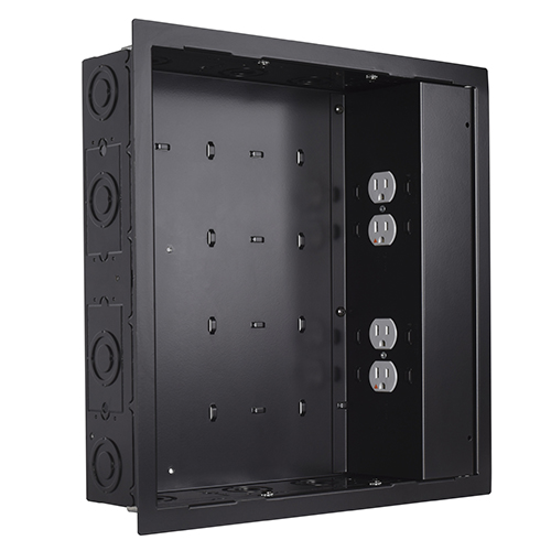 The system also offers an industry-exclusive feature: three types of knockouts per box. This provides greater flexibility for vertical and horizontal cabling between storage boxes, giving total control over power and data design. Storage boxes are designed to fit perfectly between studs. There’s no need to cut wall studs to accommodate flat panel VESA patterns because the mount supports 65-inch displays and larger sizes and are weight-rated up to 250 pounds (113 kg), covering in-wall boxes. This robust weight rating also removes the need for wood blocking reinforcement (when installed per manufacture instructions).
