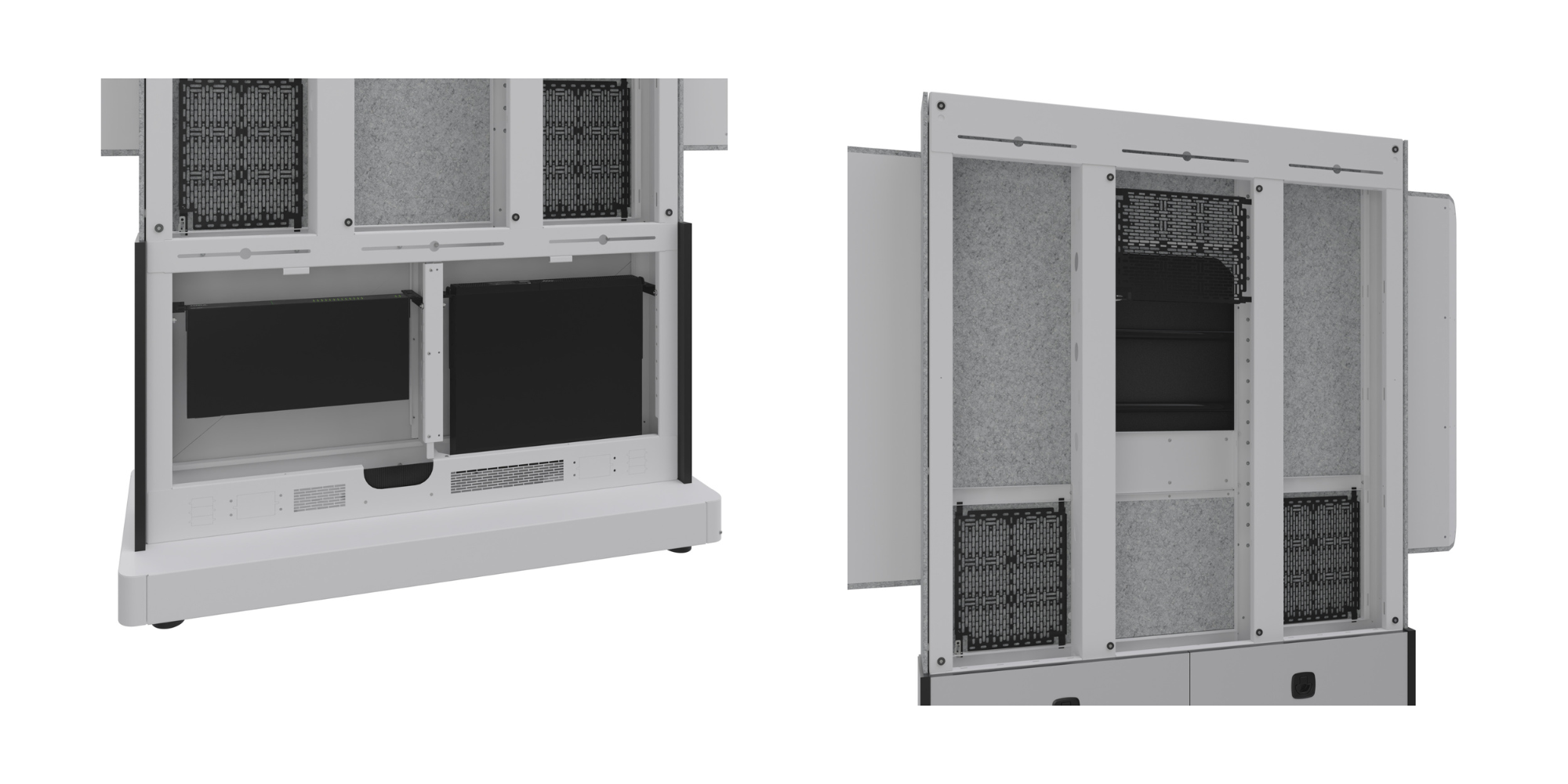Discrete rackmount and small device mounting within the display stand to support all necessary equipment for an AV system. Full access from the front via sliding doors and full access from the rear via lift off panels (Free-Standing models only).