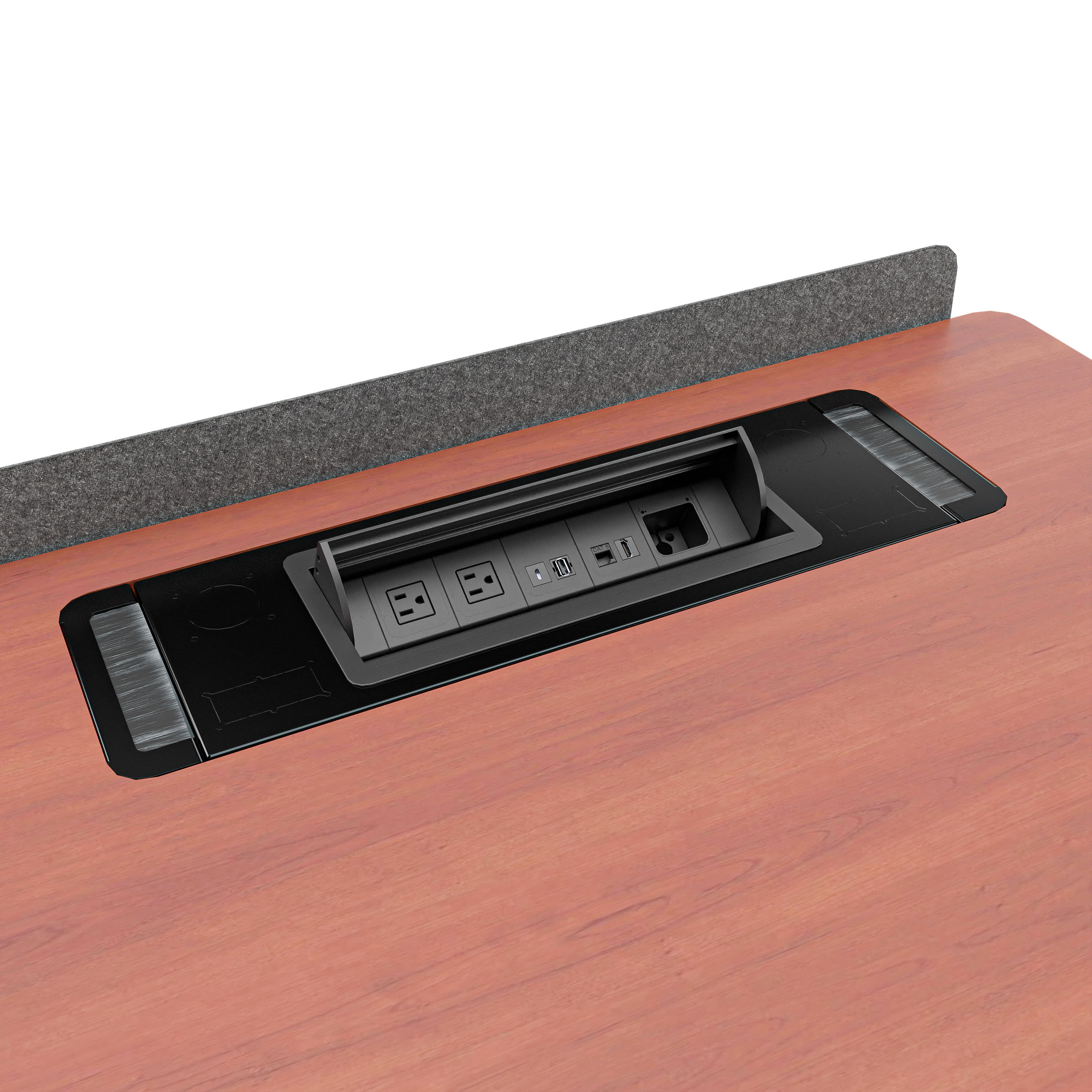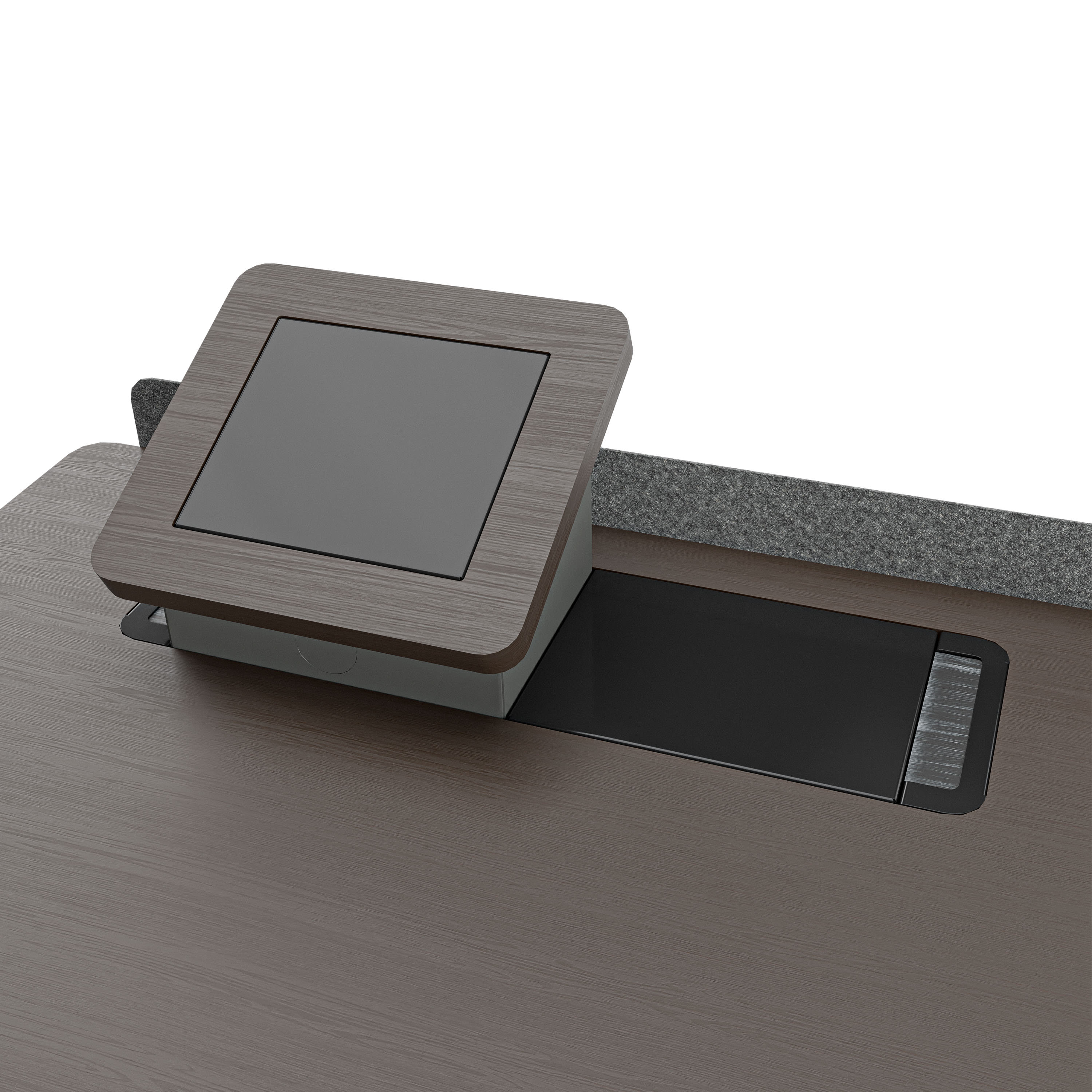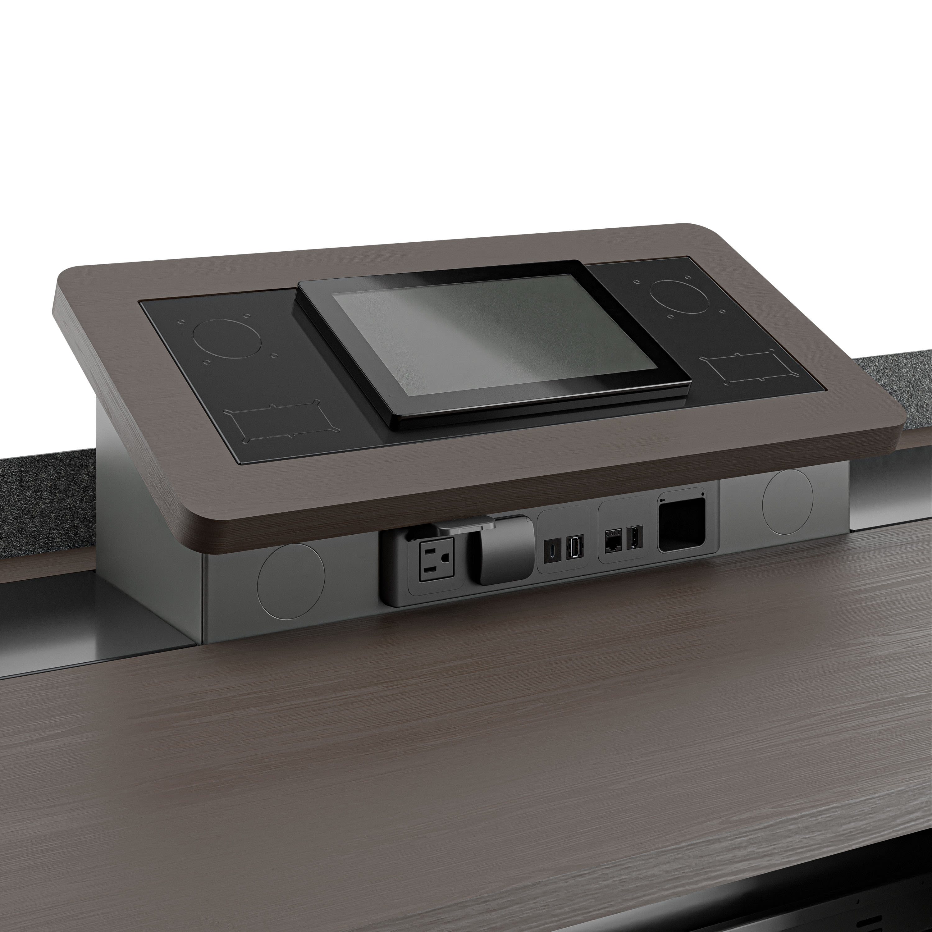 This optional matching worksurface style features a customizable Presenter's Panel™ to mount control system touch panels, microphones and task lights and includes brush grommets on both sides or knockouts underneath for cable management.