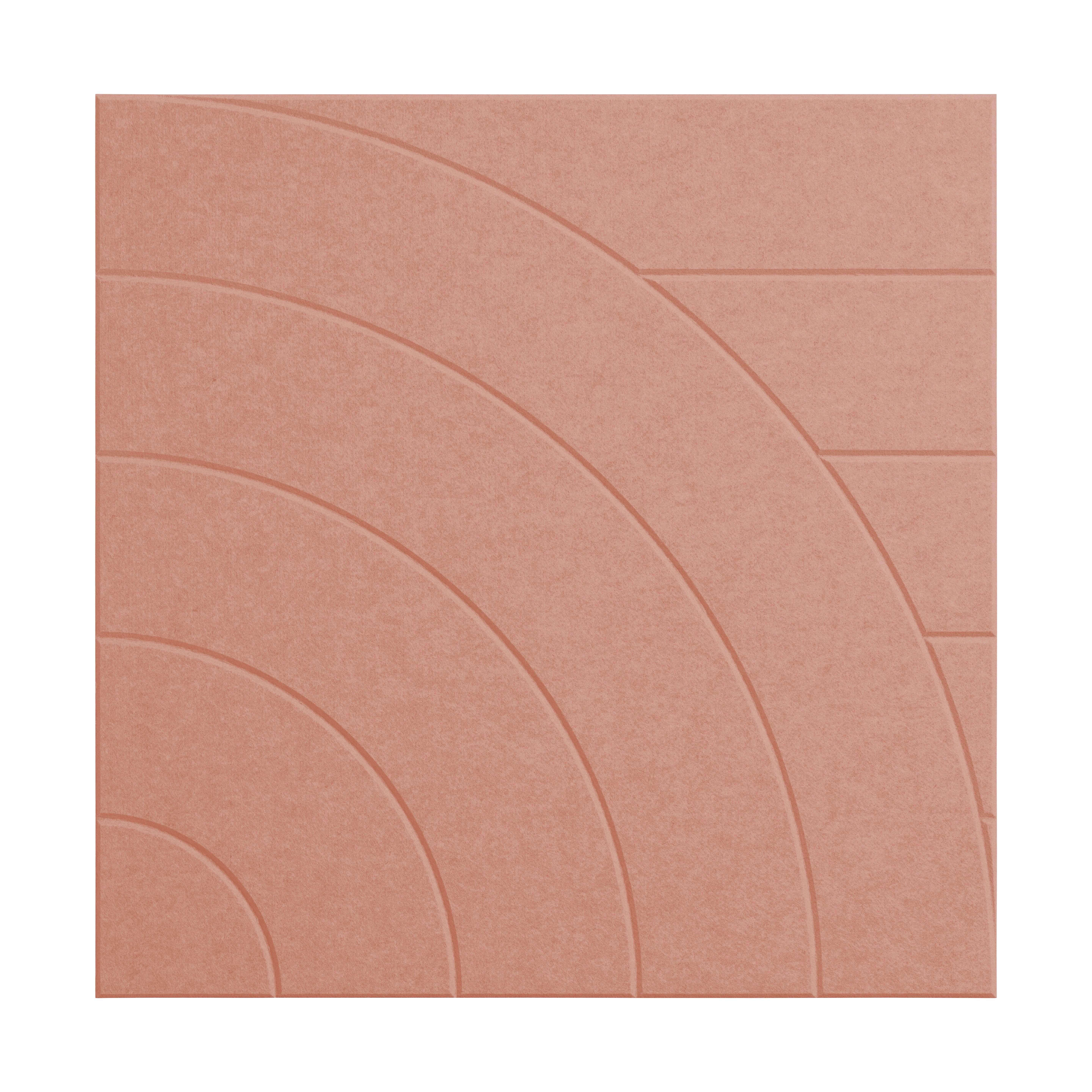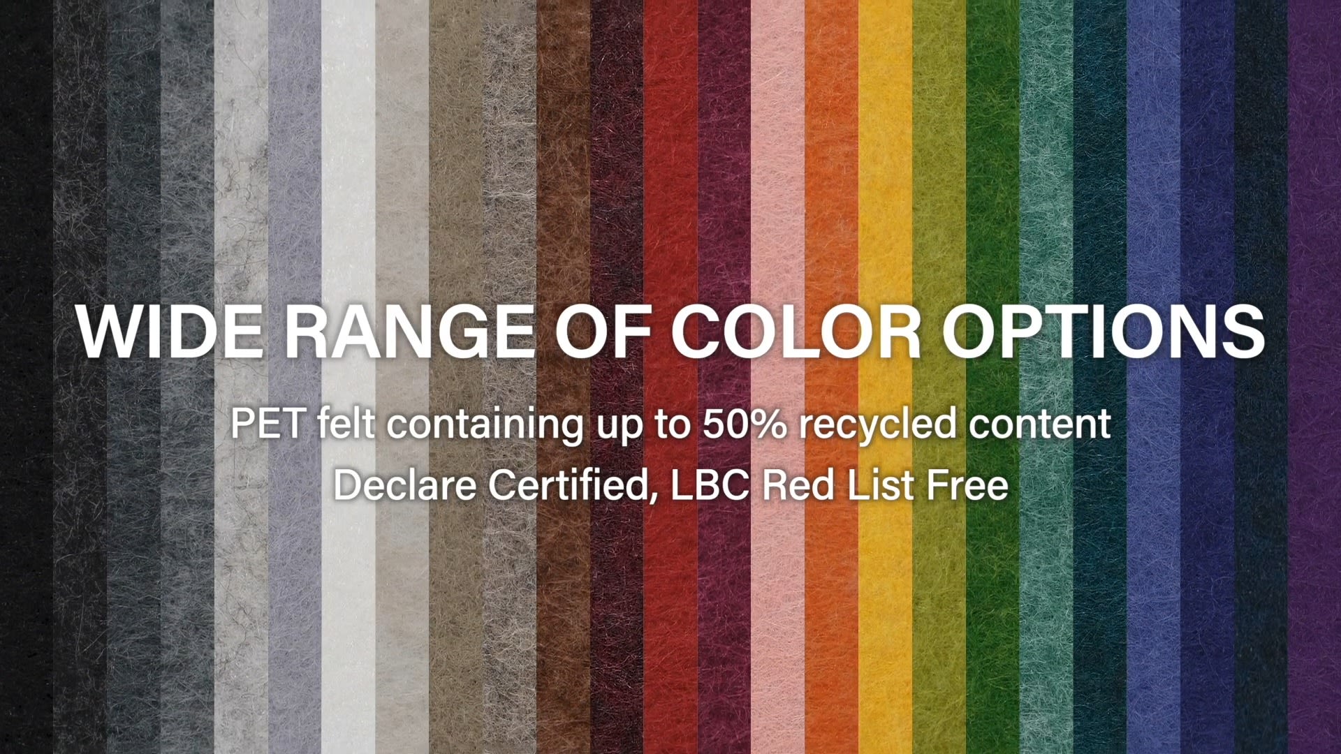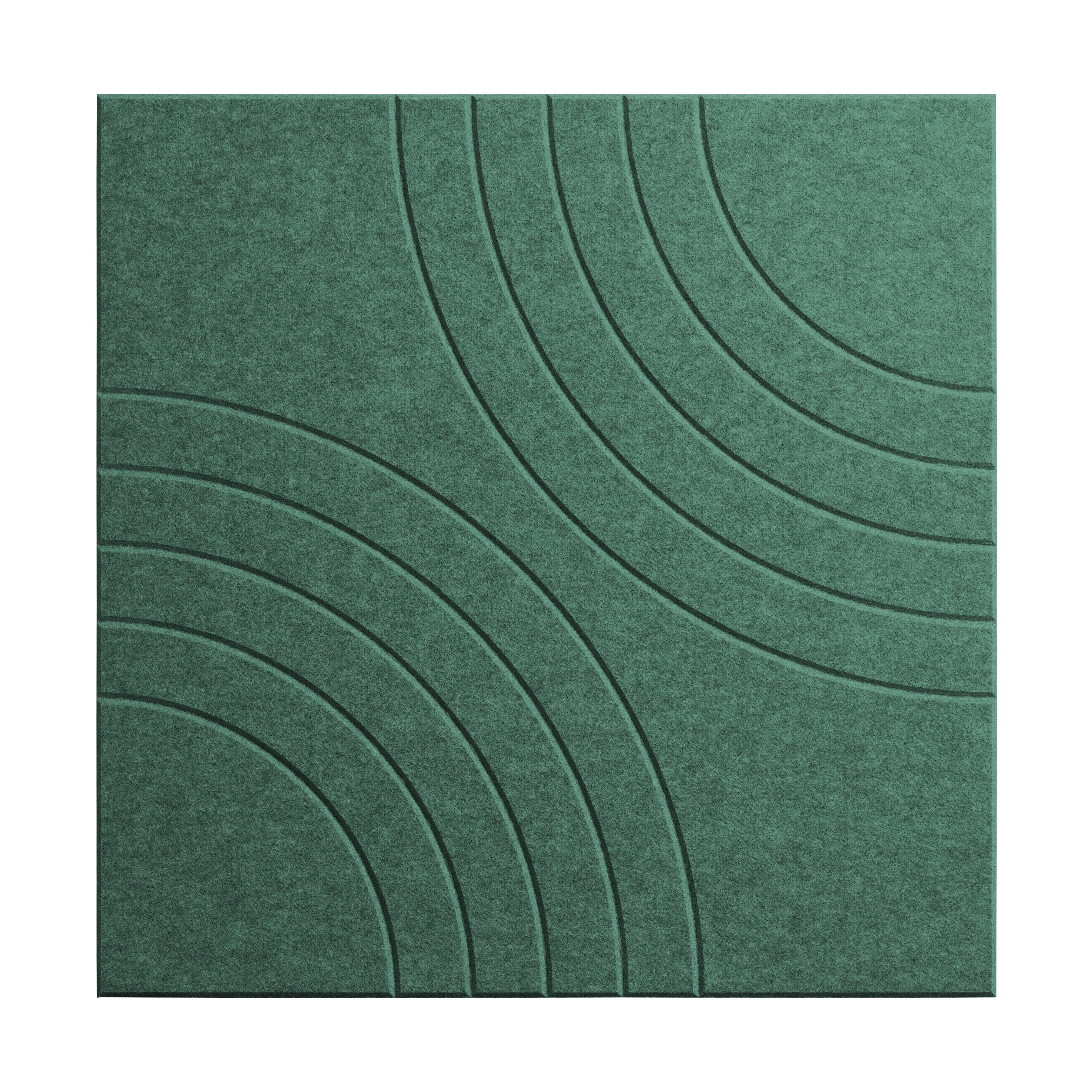 Curved and linear designs intended for vertical or horizontal installation on walls. 2' x 2' modular acoustic wall tiles made of PET felt. Available in a wide color palette, ranging from neutral to bold. Play with tile design and orientation to create bespoke installations with Solid or any of the 4 design options: Wide Arc, Double Arc, Wide Rule, or Wide Slant.