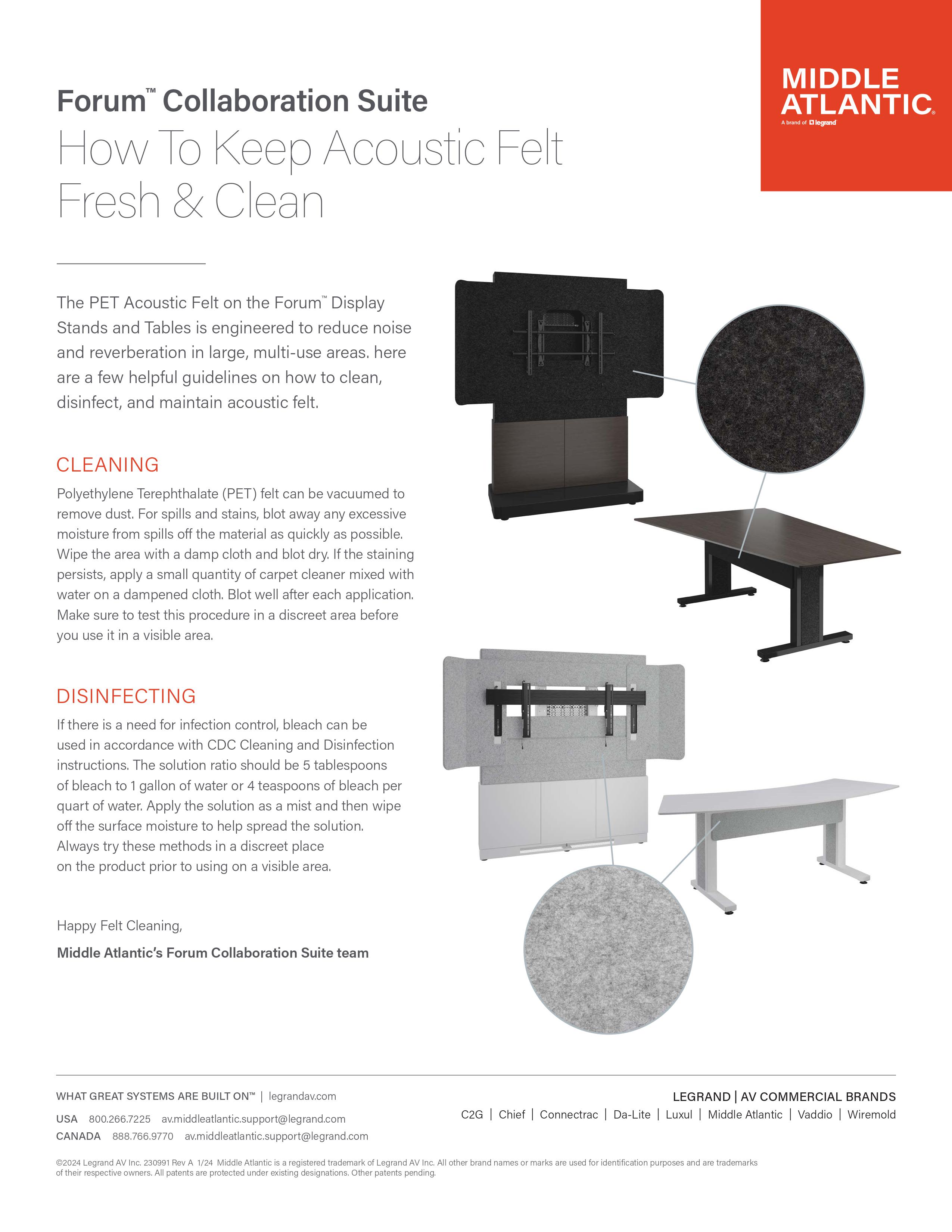 Looking to learn more about Middle Atlantic Acoustic Systems? View the resources below, including Middle Atlantic guidelines on how to maintain PET acoustic felt to keep it fresh and clean, as well as resources* published by Focal Point.