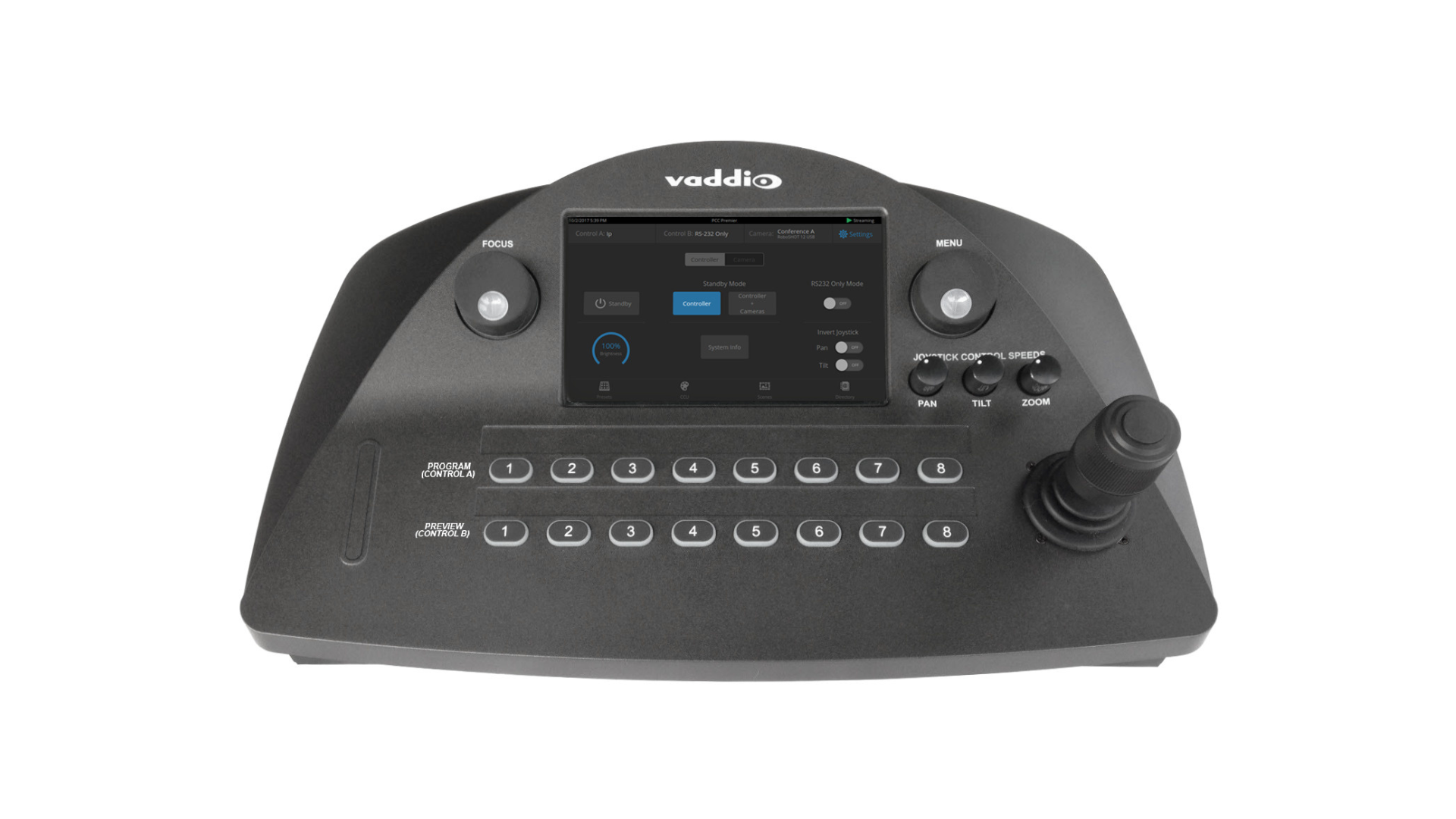 Features include a full-color touchscreen interface for easy-to-find camera functions, illuminated push buttons for camera selection, a large focus knob for fine control, and a three-axis Hall-effect joystick for smooth precise camera movements. Controls are browser-based and available through an embedded web server for control anywhere.