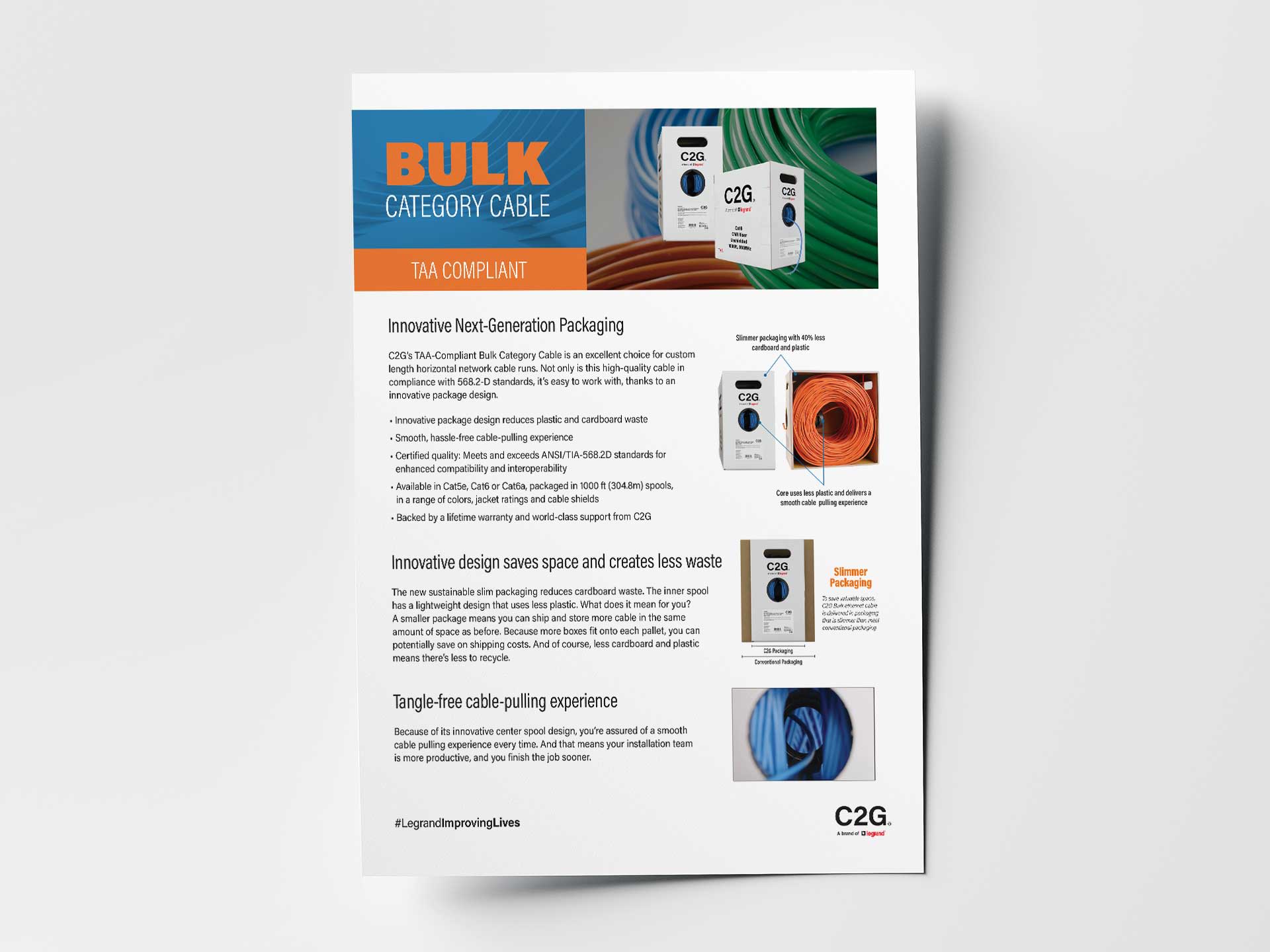 The next-generation packaging for C2G Bulk Category Cable uses less cardboard and plastic, reducing overall material usage. Its slim profile allows for the storage and shipment of more cable on each pallet, potentially leading to shipping cost savings.