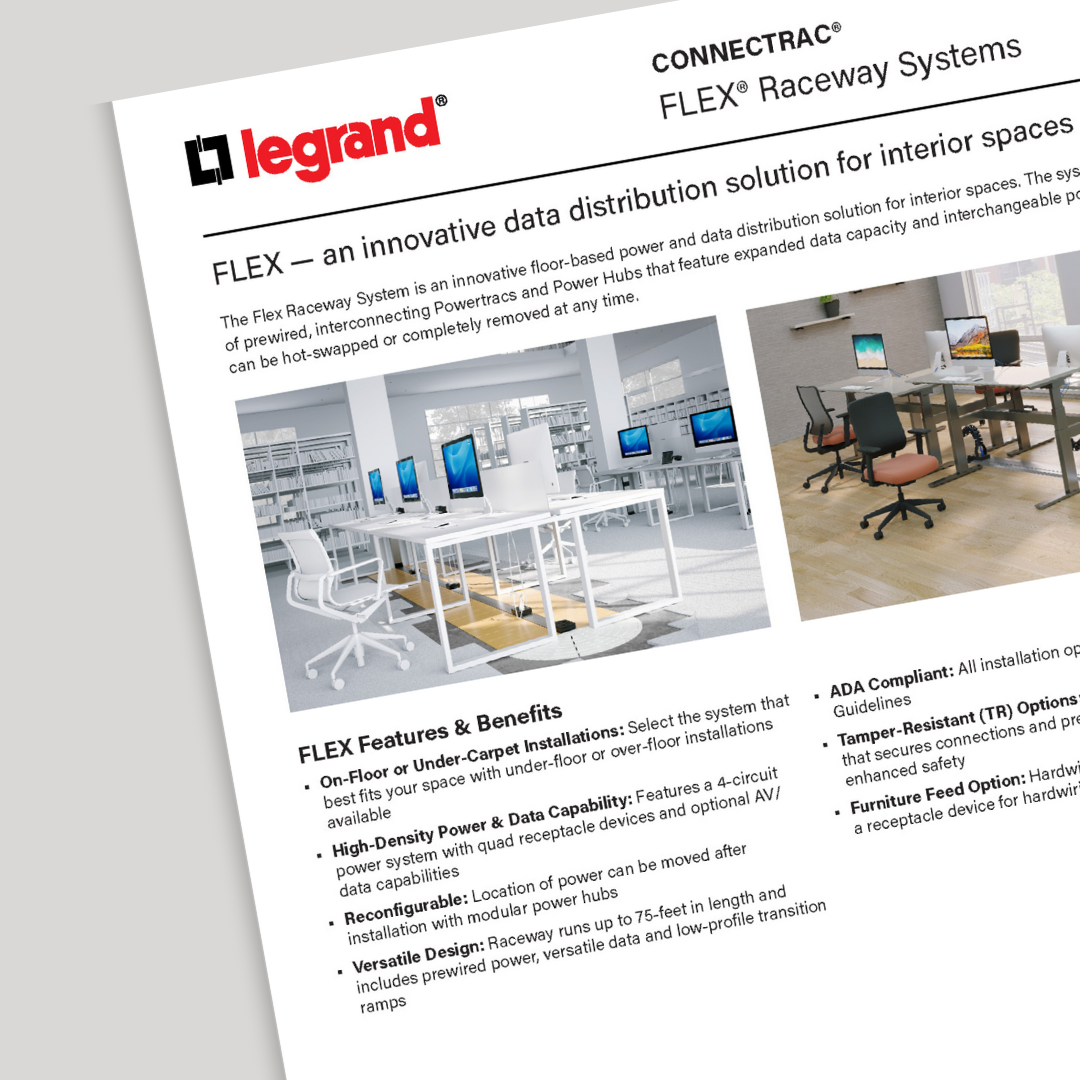 The Flex Raceway System is a revolutionary floor-based power and data distribution solution for commercial interior spaces. The system is comprised of prewired, interconnecting Powertracs and Power Hubs that feature expanded data capacity and interchangeable power devices that can easily be hot-swapped or completely removed at any time.