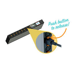 The locking outlet features comes standard on many C13 and C19 configurations, which eliminate the need to purchase a separate locking power cord. The power cords are locked when inserted and are not removable until the orange button is depressed next to the outlet. Locking outlets accept all standard and locking power cords.