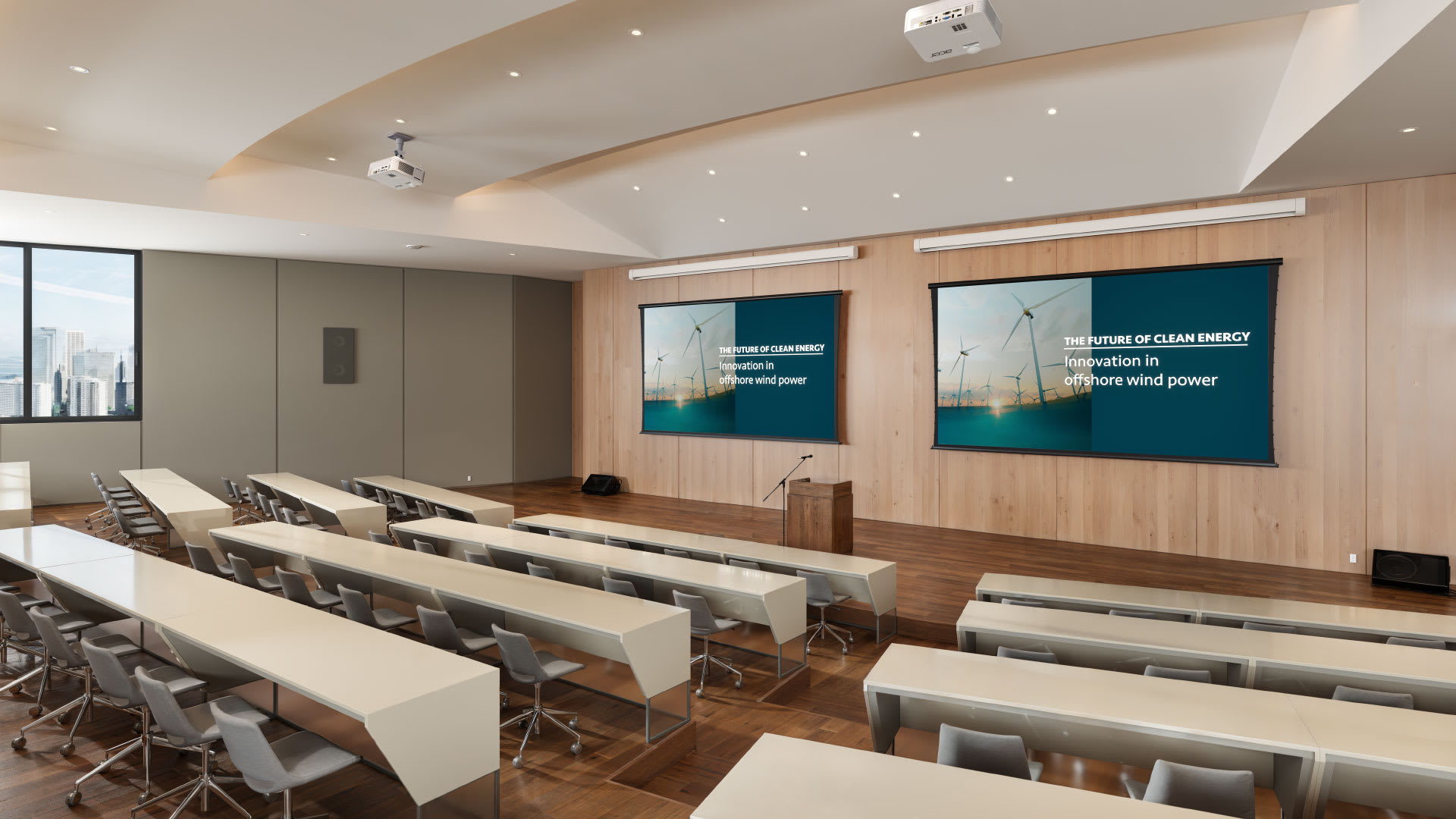 The TAA-compliant electric screen delivers large, clear classroom displays with easy mounting, ambient light rejection, and flexible height adjustment for optimal viewing and space use.